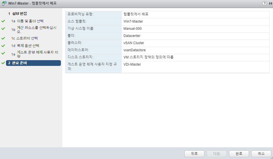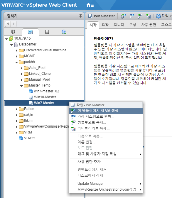 - OS 설치, VM Tools 설치, OS Optimizing, 기본 Profile 설정, Util 설치, Hostname 변경, 도메인 가입, View Agent 설치 작업이 완료된 Master Image를 템플릿으로 변환해서 준비해 주세요. (Master Image 관련 내용은 각 구축사의 기법이므로, 포스팅 할 계획이 없습니다.)