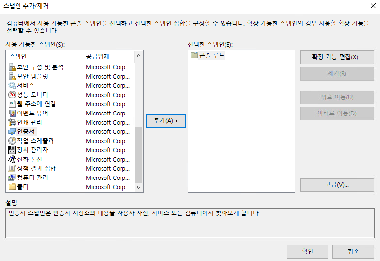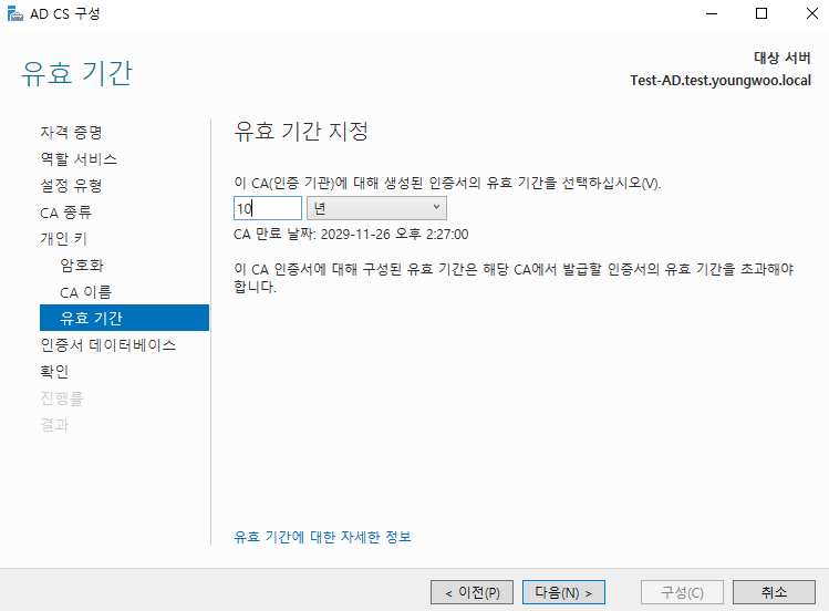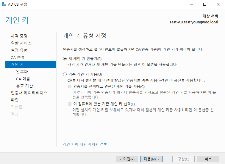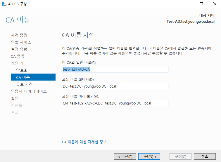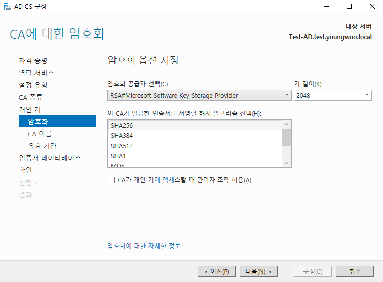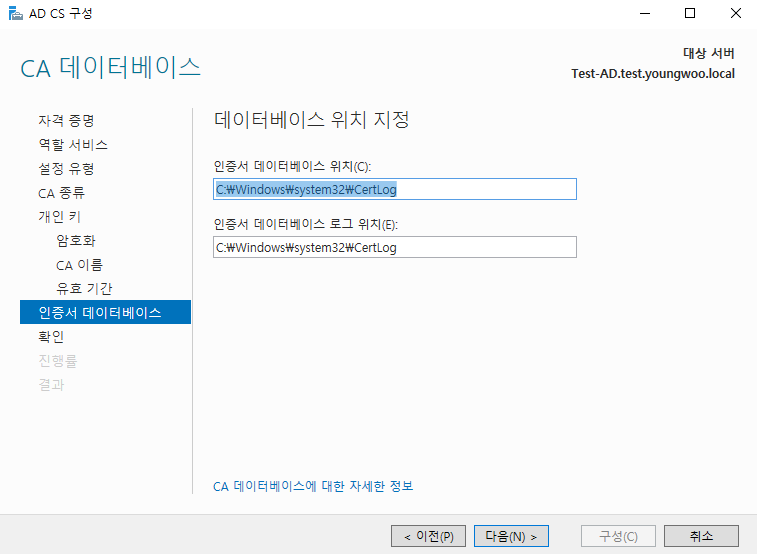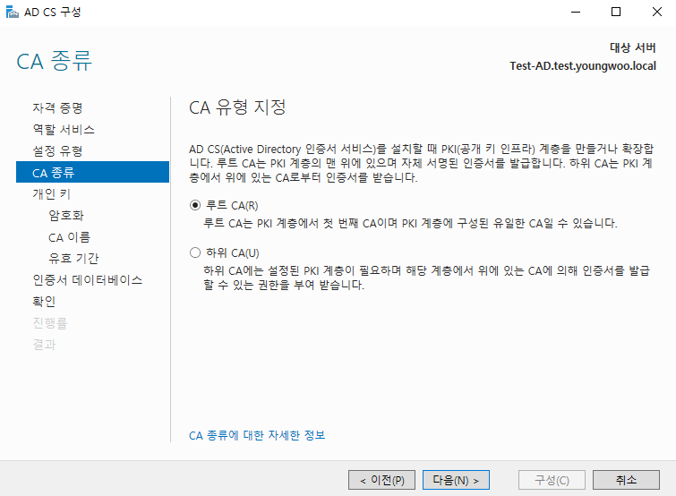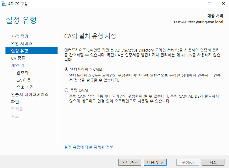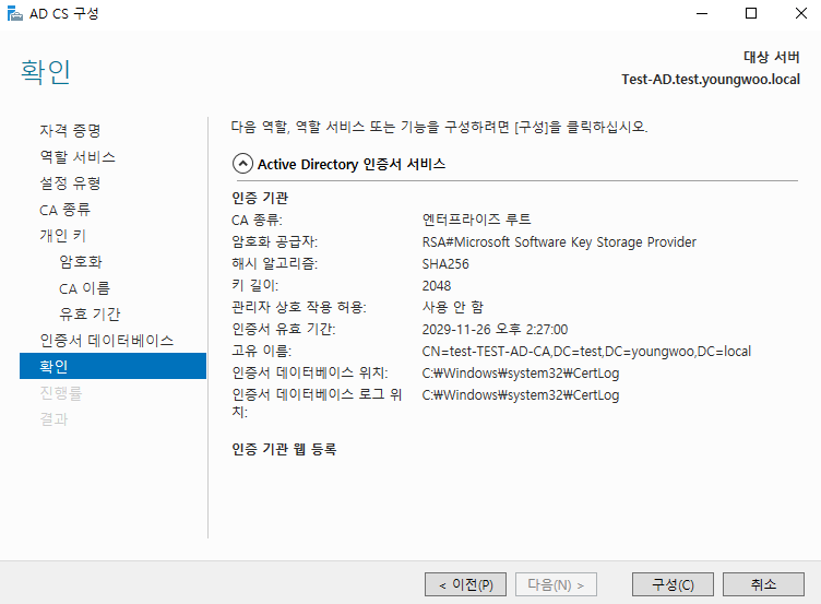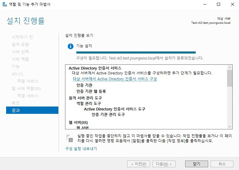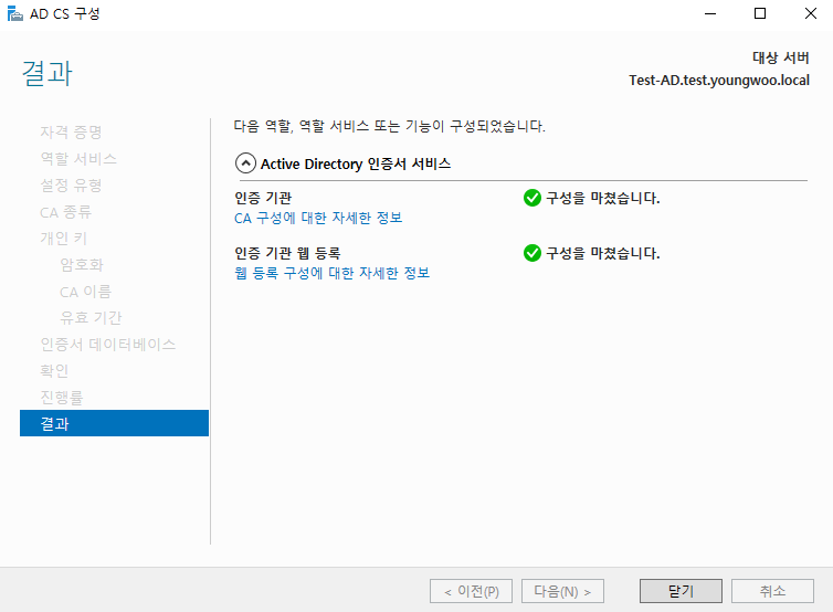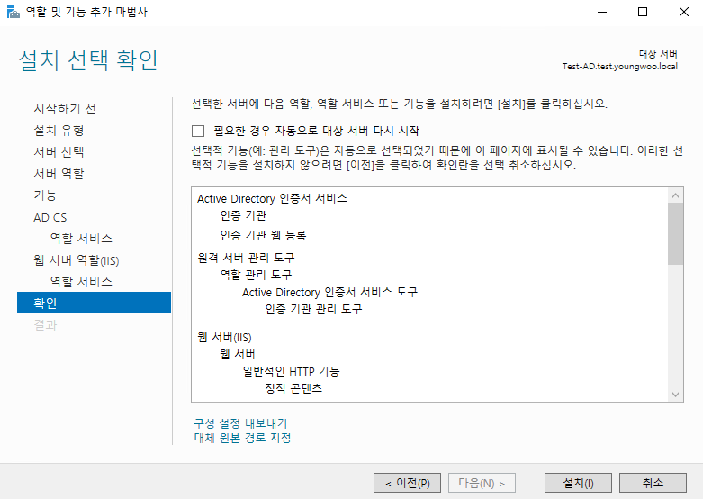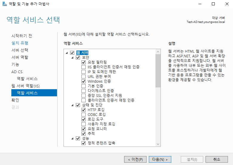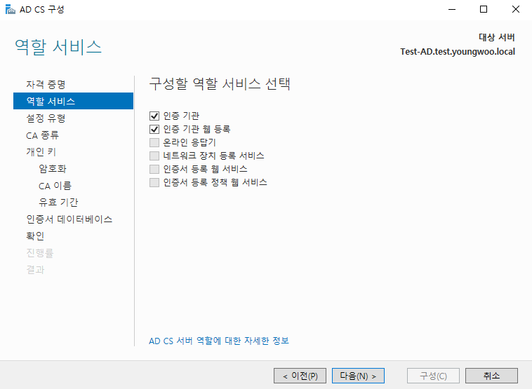 * Active Directory 인증서 서비스 - 인증 기관, 인증 기관 웹 등록 항목 체크 및 진행