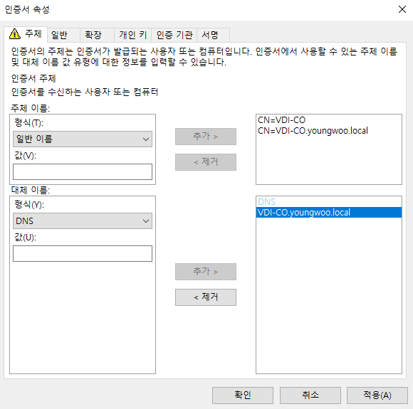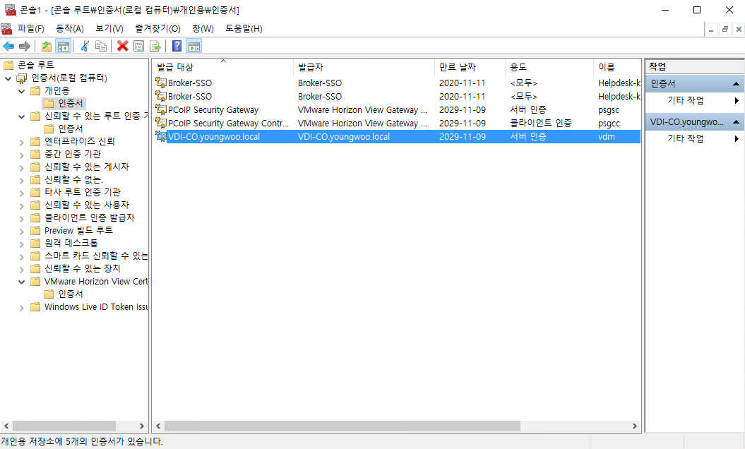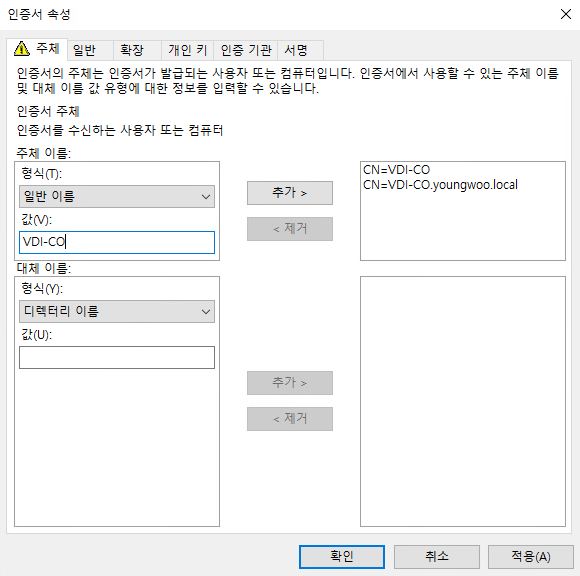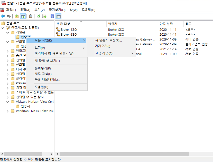 Horizon Connection Server를 구성하게 되면, 기본적으로 CA가 서명하지 않은 인증서가 있습니다. CA에서 서명하지 않은 인증서의 경우 트래픽을 가로채는 등의 보안 상의 위험한 부분이 존재하기 때문에 기본 인증서를 CA 서명된 인증서로 변경하는 것이 좋습니다.