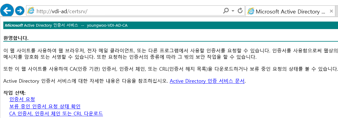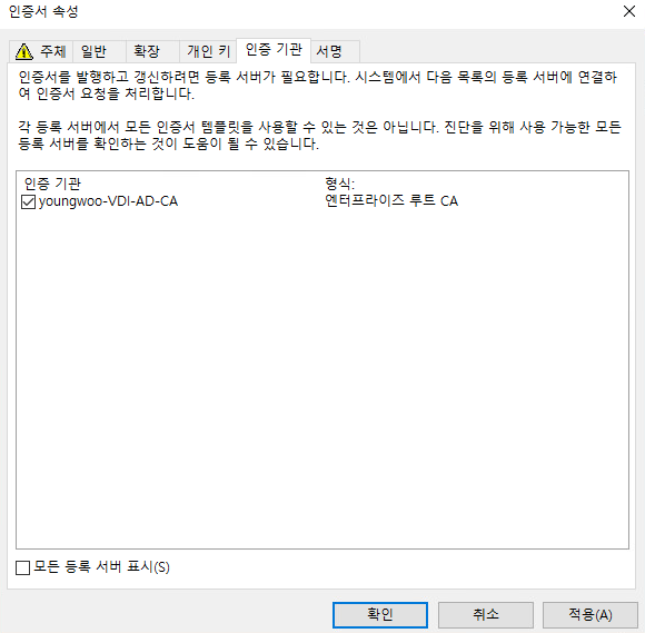 - 이 포스팅에서는 AD 서버에 CA 서버가 구성되어 있습니다.