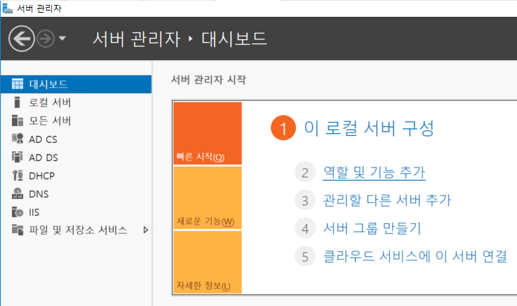 * AD 서버 - 서버 관리자 (시작 메뉴 - 서버 관리자 or 실행 (Windows Key + R) - servermanager)