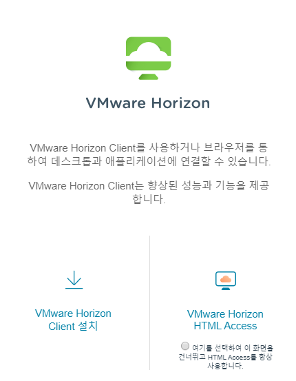 Horizon Connection Server URL로 웹페이지를 열 경우 Horizon 설치, HTML Access 연결 중 선택할 수 있으며, 이 중 Client 설치 버튼은 VMware의 Horizon Client Download 페이지로 이동할 수 있게 링크 되어 있습니다.