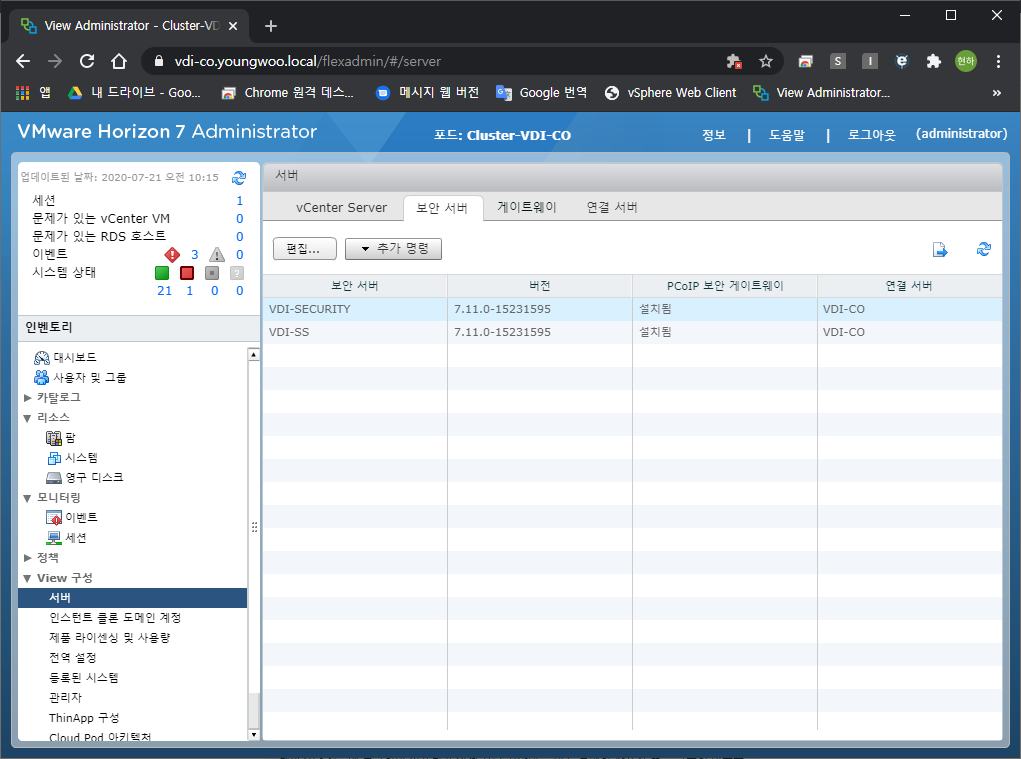 - Security Server 는 Horizon Administrator (Flex) 에서만 설정이 가능합니다. Horizon Console (HTML 5) 에서는 지원하지 않습니다.