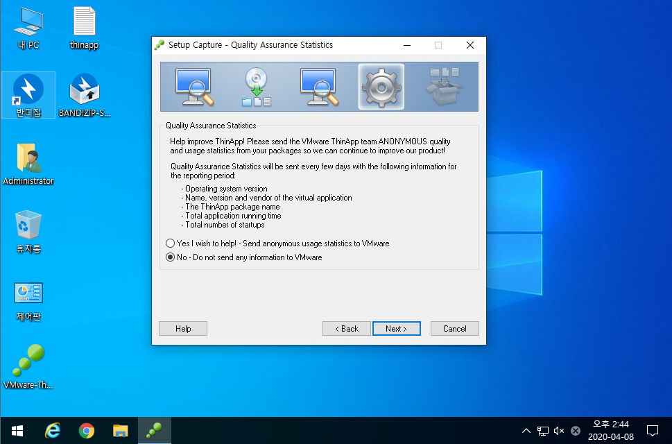 품질 개선 통계를 위한 VMware 로의 데이터 전송 여부 설정 (No) - Next