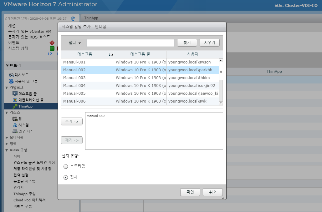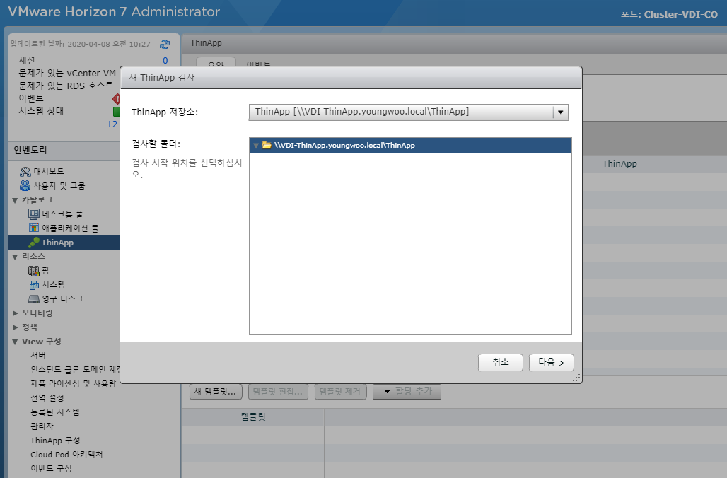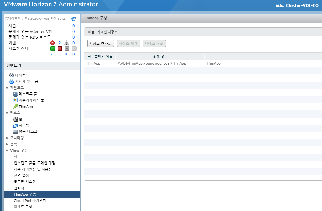 Horizon Administrator 접속 - View 구성 - ThinApp 구성 - 저장소 추가