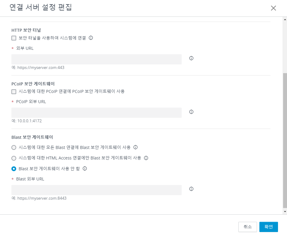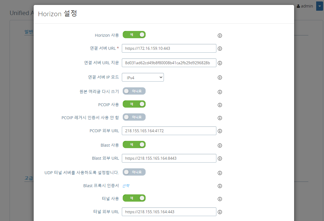 Horizon, PCoIP, Blast, 터널 사용 여부 조정 및 정보 입력 / 연결 서버 URL : 내부 주소 / PCoIP, Blast, 터널 외부 URL : 외부 주소