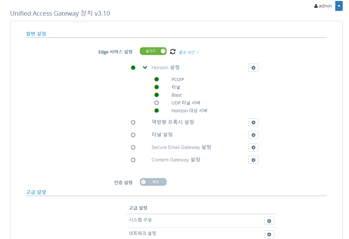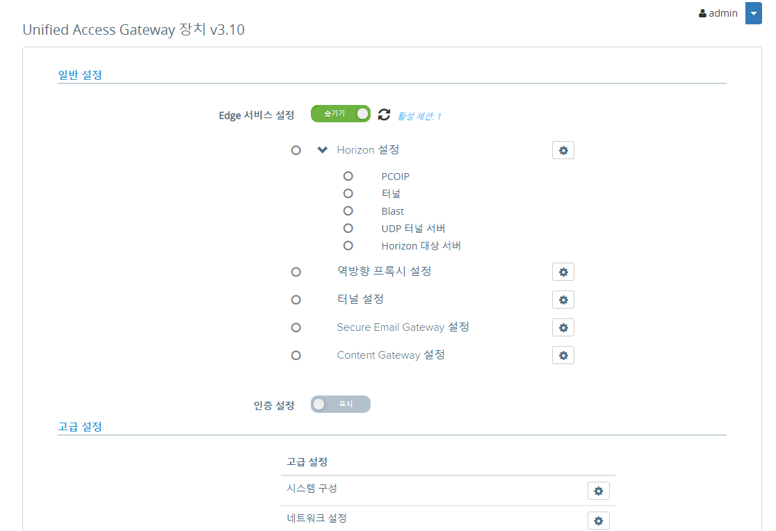Edge 서비스 설정 - 표시 - Horizon 설정 - 설정 (톱니바퀴 아이콘)
