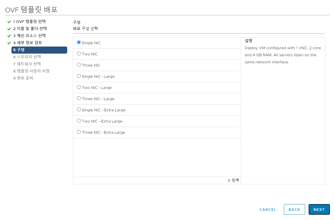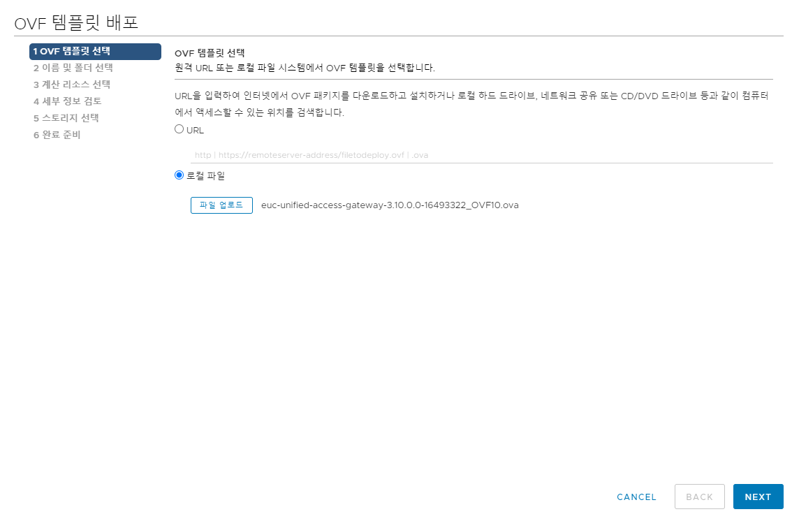 OVF 템플릿 선택 - 로컬 파일 - 파일 업로드 - 다운로드 받은 ova 파일 선택 - 다음