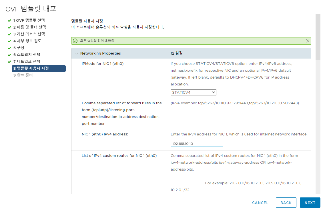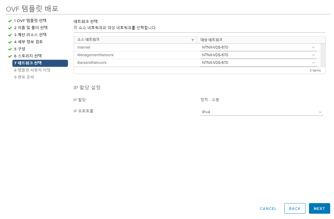 구성 네트워크 선택 (DMZ or 외부로 매핑된 네트워크 선택) - IP 할당 옵션 지정 - 다음