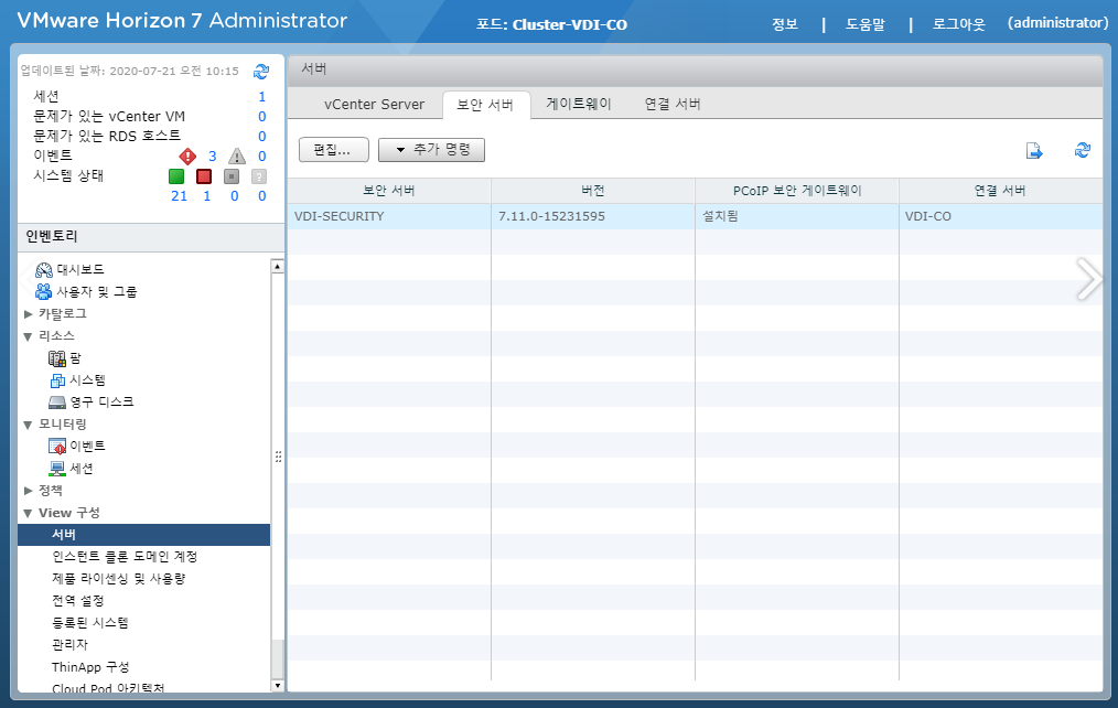 - Security Server 는 Horizon 8 버전부터 단종 되었으며, 설정이 불가능 합니다. 기존 Security Server의 기능을 사용하려면 UAG로 전환 구축을 해야합니다.