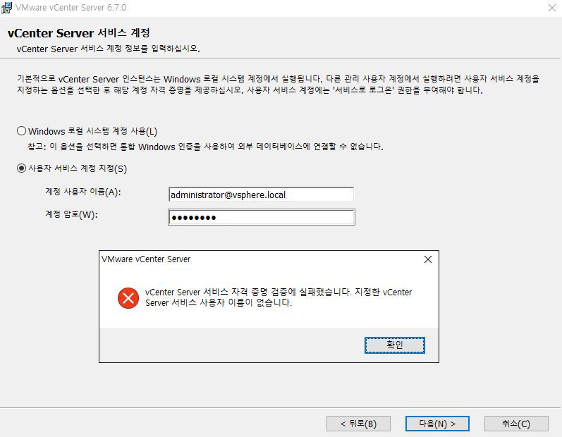 - 사용자 서비스 계정에 서비스로 로그온 권한이 없어서 검증 실패 메세지가 나타납니다.