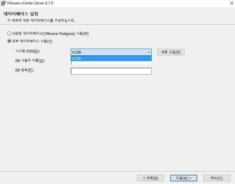 - vCenter DB 선택, DB 사용자 계정 및 암호 입력하세요.