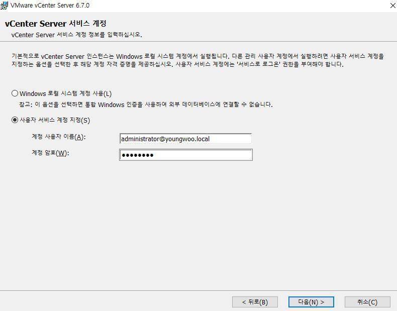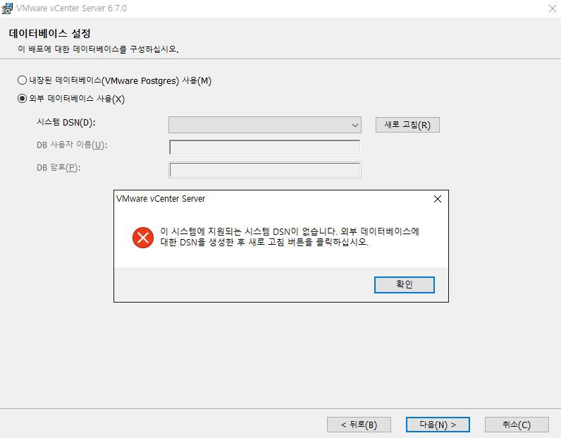 - vCenter DB 선택, DB 사용자 계정 및 암호 입력하세요.