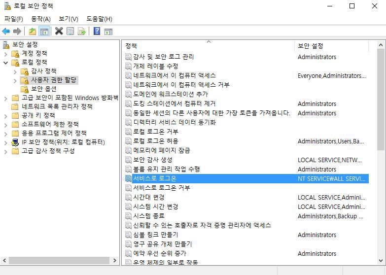 - 로컬 보안 정책 - 보안 설정 - 로컬 정책 - 사용자 권한 할당 - 서비스로 로그온