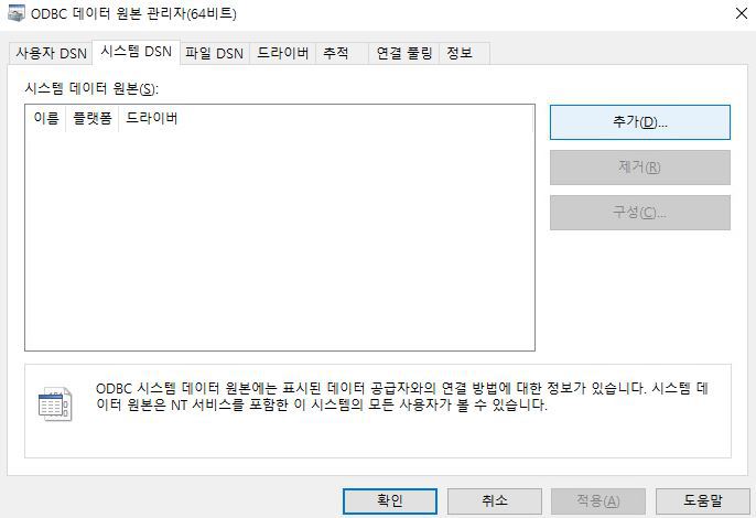 - DSN 목록을 불러 올 수 없습니다. DSN 등록을 아예 하지 않았기 때문입니다.